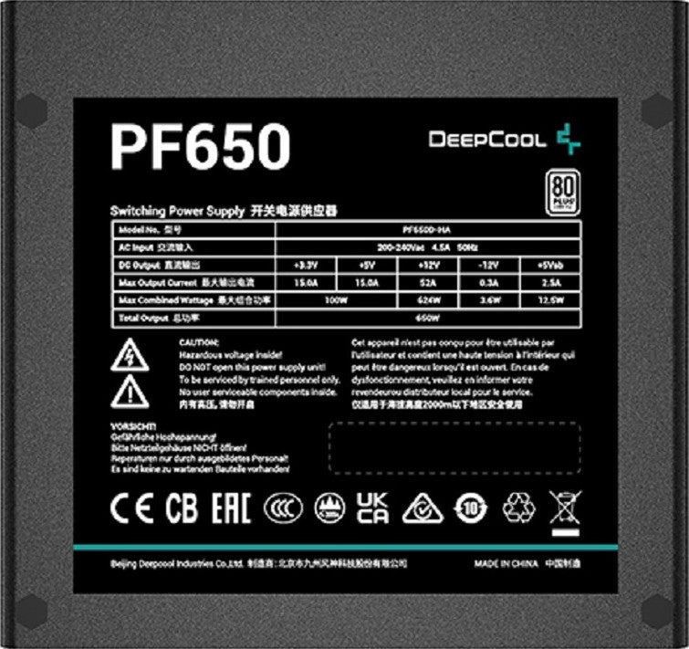 Deepcool PF650D 650W 80+ Standard Power Supply, 120mm Fan Size, Hypro Bearing, Active PFC + Double Tube Forward, Taiwan Bulk Capacitor, OPP/OVP/SCP Protection, Black | R-PF650D-HA0B-UK
